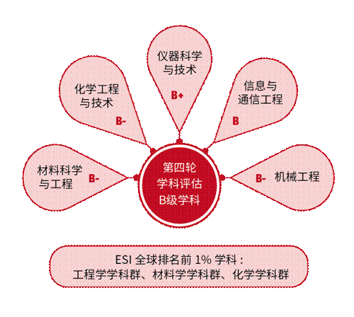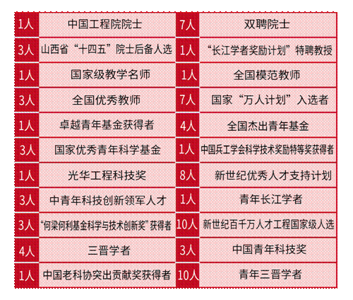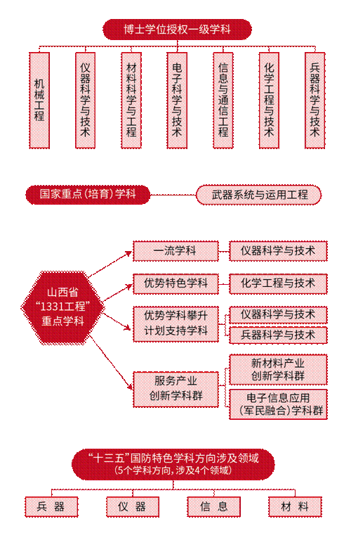 学校现有国家重点(培育)学科1个,国防科工局“十三五”国防特色学科(方向)5个,省重点学科24个,山西省“1331工程 ”一流学科1个,山西省“1331工程”优势特色学科1个,山西省优势学科攀升计划支持学科2个,山西省服务产业创新学科群2个。拥有博士后流动站6个,博士学位授权一级学科7个,博士点24个,硕士学位授权一级学科23个,硕士点64个,硕士专业学位授权点涉及5大类别,13个领域,本科专业85个。工程学学科群、材料学学科群、化学学科群ESI排名位列全球前1%,仪器科学与技术学科在全国第四轮一级学科评估中获评B+。
