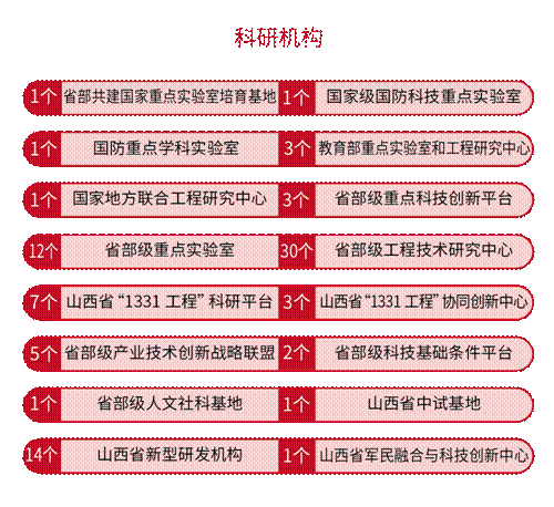 适应国家创新驱动发展战略需求,形成问题导向、协同创新、军民 融合、充满活力的科技创新机制,全面强化服务国防服务地方两翼齐飞,凸显科技创新能力和服务社会能力。拥有省部级以上科研机构59个,拥有山西中北国家大学科技园等科技产业孵化基地。设有军民融合协同创新研究院、先进能源材料与系统研究院、特种金属材料与装备研究院、前沿交叉科学研究院等研究机构。