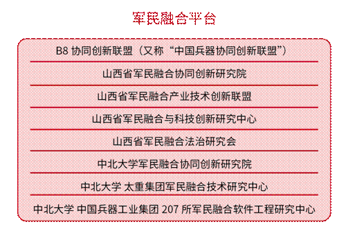 学校坚持把军民融合作为引领内涵发展的学校战略,在国防军工人才培养、国防科技协同创新、科技成果转化孵化等方面业已形成显著优势。目前,学校拥有“十三五”国防重点学科5个,在地方共建高校中排名第一。拥有国防科技重点实验室、重点学科实验室、先进技术工程中心等“国字号”国防科研平台。国防创新计划重大专项立项数和经费数不断攀升。学校始终把军民融合成果转化作为服务地方、服务国防的重要举措,积极推进军民融合成果转化研发和产业化进程,已遴选并积极推动40多项可产业化且前景广阔的军民融合成果就地转化。同时,学校积极构建军民融合人才培养新体系,营造校园军工文化,走出了一条人才培养的军民融合特色之路。